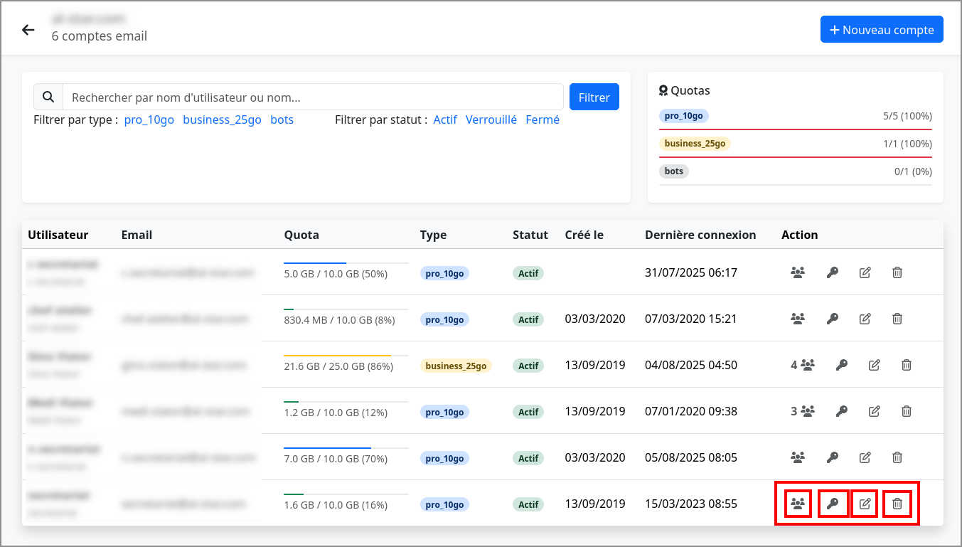 Dans l’onglet Comptes email de votre organisation, vous pouvez :