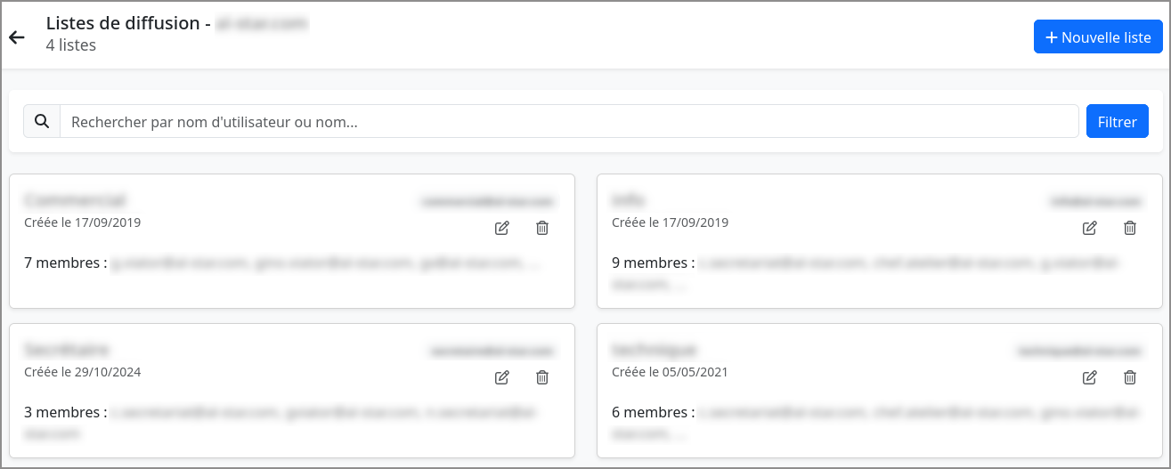 En cliquant sur le lien Listes de diffusion de votre organisation, vous accédez à l’interface dédiée.