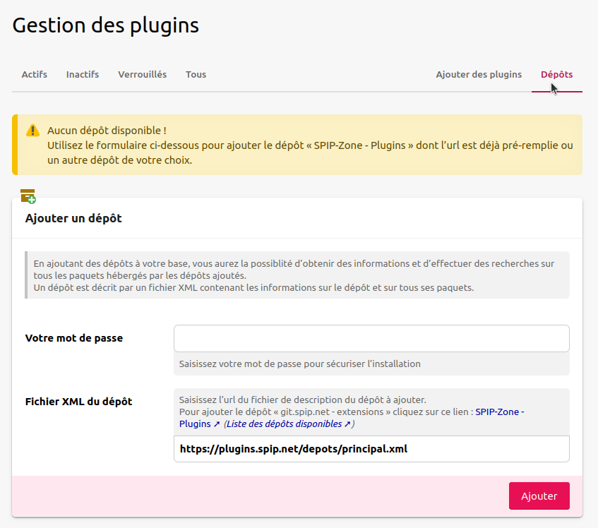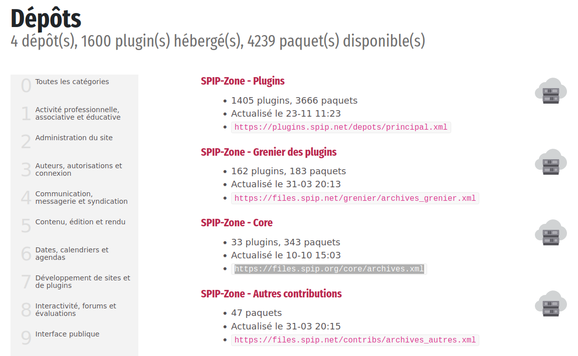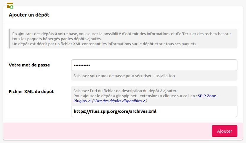 Il vous faudra certainement ajouter le dépôt SPIP-Core. Pour cela cliquez sur le lien "Liste des dépôts disponibles" situé au niveau de l'encadré a droite de "Fichier XML du dépôt". Accéssible également en cliquant ici.